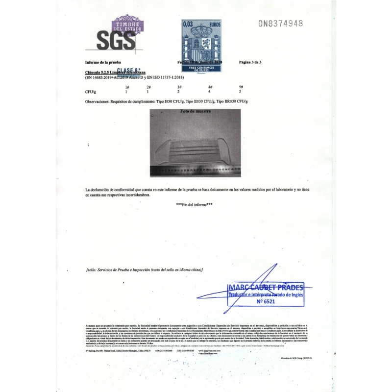 Die chirurgische Einwegmaske des Typs IIR hat eine bakterielle Filtrationseffizienz von mehr als 98%. Hergestellt in Übereinstimmung mit der Richtlinie 93/42/EWG über Medizinprodukte gemäß EN 14683:2019+AC:2019. Testbericht von SGS genehmigt und CE-gekennzeichnet.