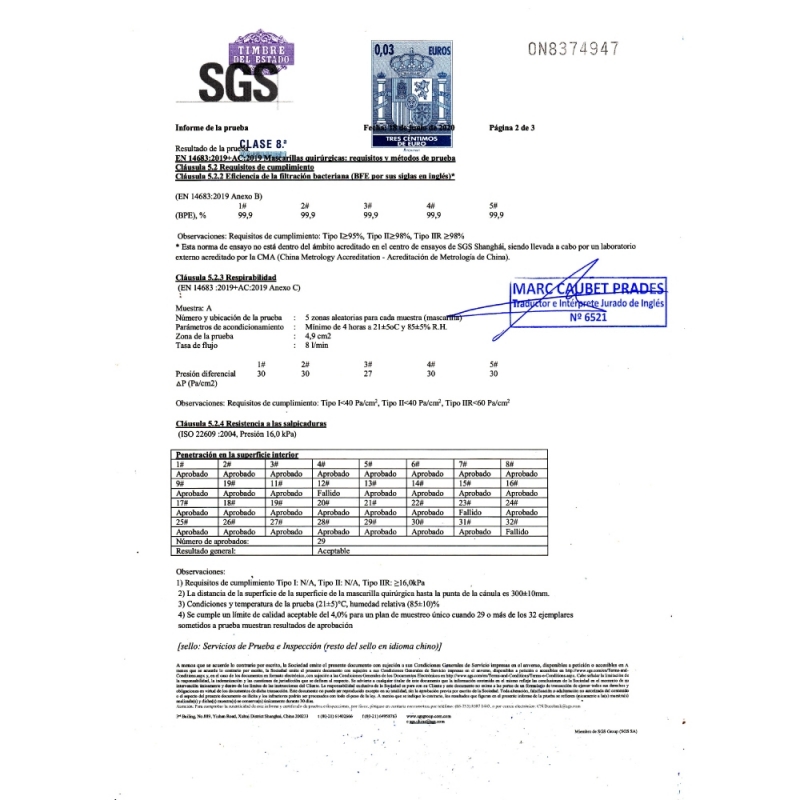 Die chirurgische Einwegmaske des Typs IIR hat eine bakterielle Filtrationseffizienz von mehr als 98%. Hergestellt in Übereinstimmung mit der Richtlinie 93/42/EWG über Medizinprodukte gemäß EN 14683:2019+AC:2019. Testbericht von SGS genehmigt und CE-gekennzeichnet.
