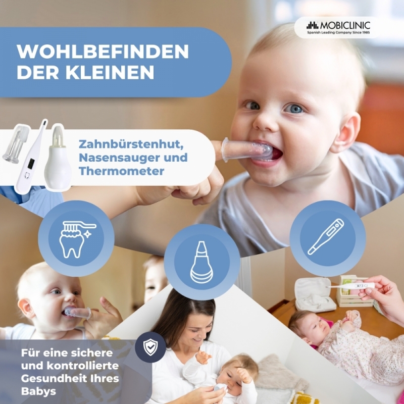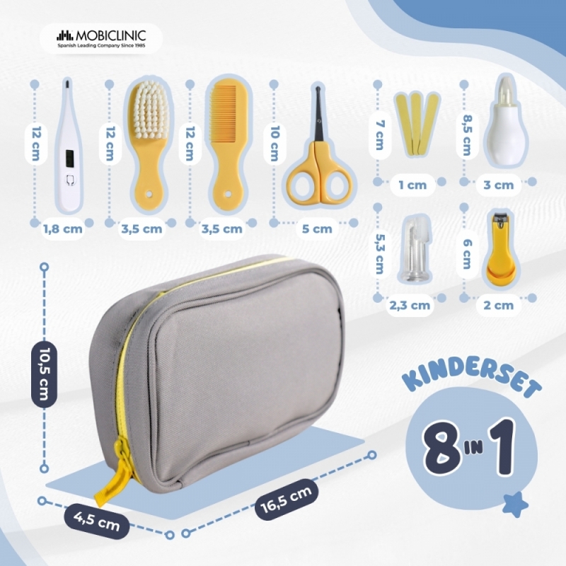 Es verfügt über ein digitales Thermometer, einen Kamm, eine Bürste mit extra weichen Borsten, eine abgerundete Schere, einen Nagelknipser, einen Nasensauger, eine Nagelfeile und eine Fingerzahnbürste. Alle Artikel sind von höchster Qualität und wurden konzipiert, um Kinder zu pflegen und zu schützen.