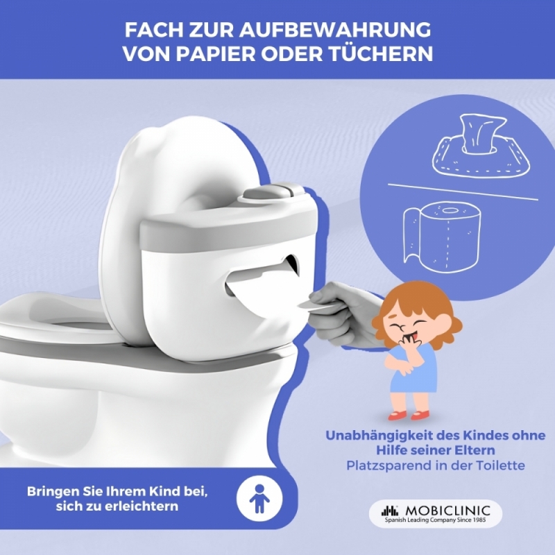 Darüber hinaus verfügt dieses Modell über einen speziellen Bereich zum Ablegen von Toilettenpapier oder Tüchern an der Stelle, an der sich der Spülkasten befindet. Um Platz zu sparen, nutzt die Toilette dieses Fach, sodass das Kind unabhängig wird und sich ohne Hilfe seiner Eltern selbstständig machen kann.