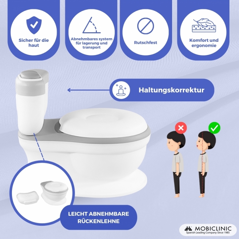 Das Design dieser Babytoilette ist darauf ausgelegt, dank der Rückenlehne den Komfort und die richtige Haltung des Kindes zu gewährleisten. Ebenso verhindert die rutschfeste Oberfläche, dass es gelegentlich zu Unfällen kommt oder dass sich das Produkt leicht bewegt.