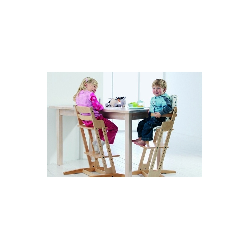 La trona evolutiva Danchair permite que el niño se instale y desarrolle de forma segura en función de su crecimiento, ya que ofrece una gran capacidad de adaptación. En efecto, el asiento y el tablero pueden fijarse a diferentes niveles (14 posiciones diferentes) variando la altura del asiento y la altura entre el asiento y el tablero. El respaldo está equipado con una barandilla de madera y una correa para evitar que el niño se deslice hacia delante.
