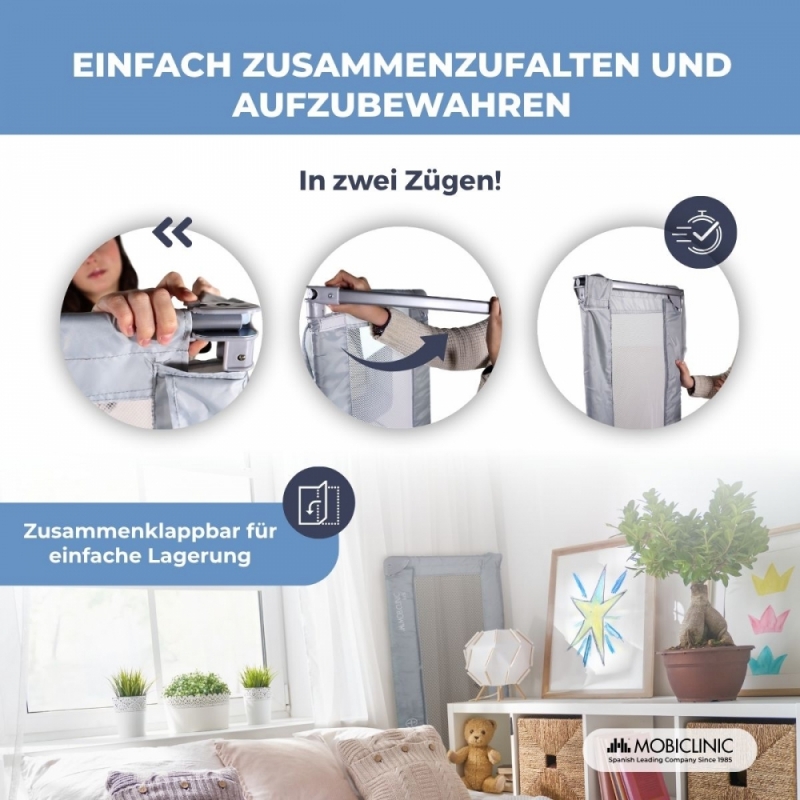 EINFACHE UND SCHNELLE MONTAGE : Intuitives Design für werkzeuglosen Auf- und Abbau. Einfach die Geländerstütze unter die Matratze legen, den Sicherheitsgurt einstellen und schon kann es losgehen.