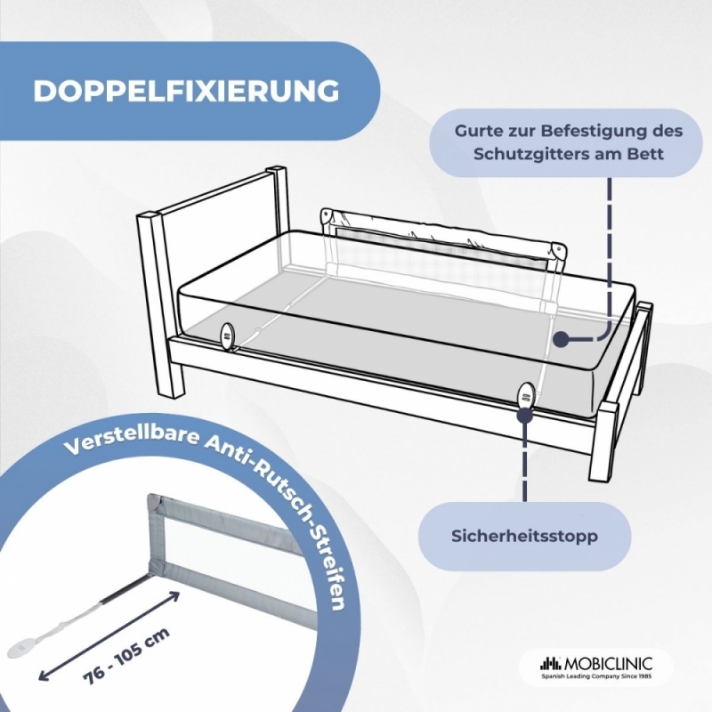EXTRA SICHERHEIT MIT BEFESTIGUNGEN : Das Doppelverriegelungssystem mit Anker und zusätzlichem Sicherheitsgurt unter der Matratze sorgt dafür, dass das Schutzgitter fest an seinem Platz bleibt und sich nicht vom Bett löst. Die perfekte Lösung für die Sicherheit der Eltern und die Sicherheit der Kleinen!