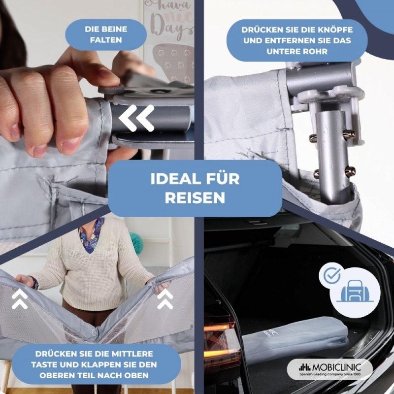FALTBARES UND TRANSPORTABLES DESIGN : Diese Barriere wurde mit Blick auf Ihre Bequemlichkeit entworfen. Sie kann zusammengeklappt werden und verfügt außerdem über eine Reisetasche, sodass sie noch bequemer zu transportieren und unterwegs einfach zu verwenden ist. Praktisch und leicht!