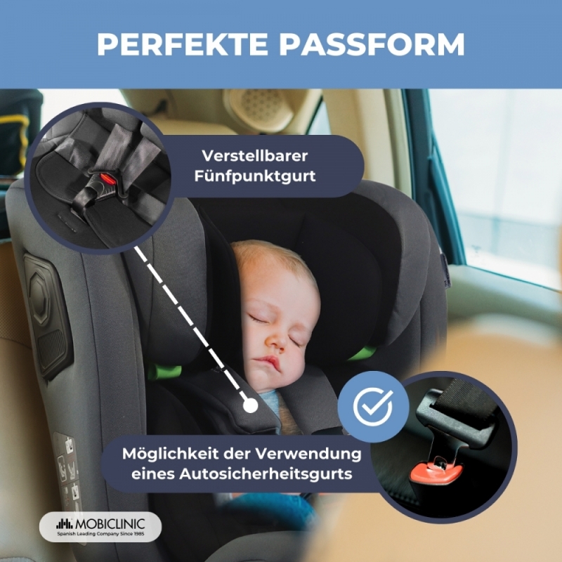 Ausgestattet mit einem Top-Tether-Sicherheitssystem garantiert der Stuhl eine zusätzliche Fixierung als dritter Ankerpunkt, der im Falle einer Kollision eine Vorwärtsbewegung verhindert und bei jeder Fahrt eine hervorragende Stabilität gewährleistet. Darüber hinaus verfügt es über einen integrierten und verstellbaren 5-Punkt-Gurt, der das Kind sicher festhält und die Kräfte gleichmäßig verteilt, um Risiken zu minimieren.