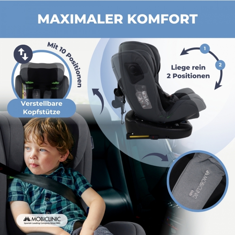 Die 360°-Drehung des Stuhls vereinfacht die Handhabung und ermöglicht eine einfache Positionierung des Kindes aus jedem Winkel. Darüber hinaus besteht die Möglichkeit, den Stuhl je nach Entwicklungsstadium nach vorne oder hinten auszurichten. Die Kopfstütze ist in 10 Positionen verstellbar, so dass der Stuhl mit dem Kind mitwächst und sich jederzeit an dessen Körpergröße anpasst. Darüber hinaus verfügt er über mehrere Liegepositionen sowohl nach vorne als auch nach hinten.