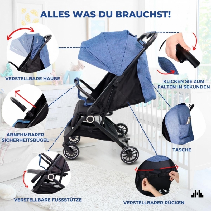 Was den Trip Kinderwagen so einzigartig macht, ist sein tragbares Design aus robustem Stahl mit einer praktischen Zugstange und einem bequemen Einhand-Faltsystem. Egal, ob Sie mit dem Auto oder den öffentlichen Verkehrsmitteln unterwegs sind, dieser Kinderwagen ist kompakt genug, um überallhin mitgenommen und problemlos verstaut zu werden, ohne viel Platz einzunehmen.
