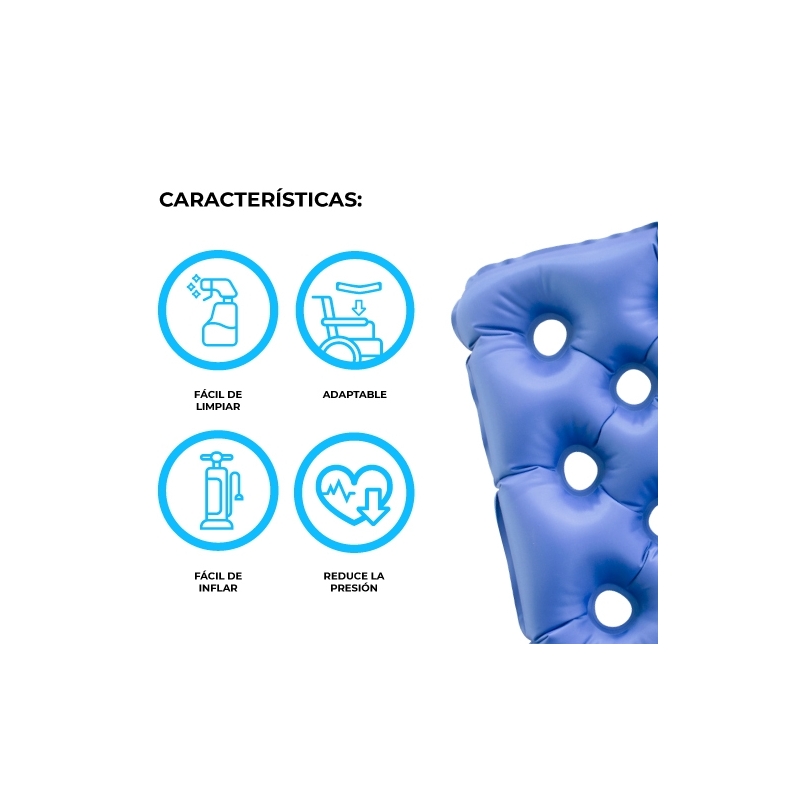 Diese Art von aufblasbaren Kissen dient normalerweise als Sitzfläche, die an die Maße von Stühlen, Sesseln oder Rollstühlen angepasst werden kann. Seine Hauptfunktion besteht darin, durch Geschwüre verletzte Körperbereiche wie Füße, Ohren, Hinterkopf, Rückseite der Schultern, unteren Rücken, Kreuzbein, Fersen, Knöchel, Ellbogen und Knie zu stützen.