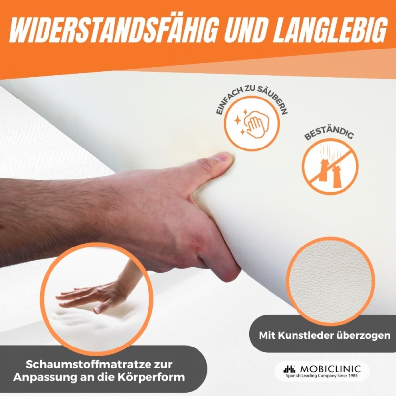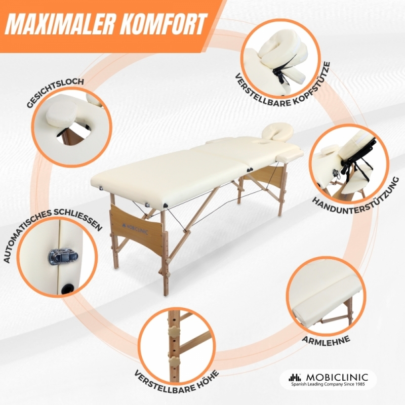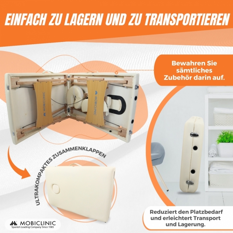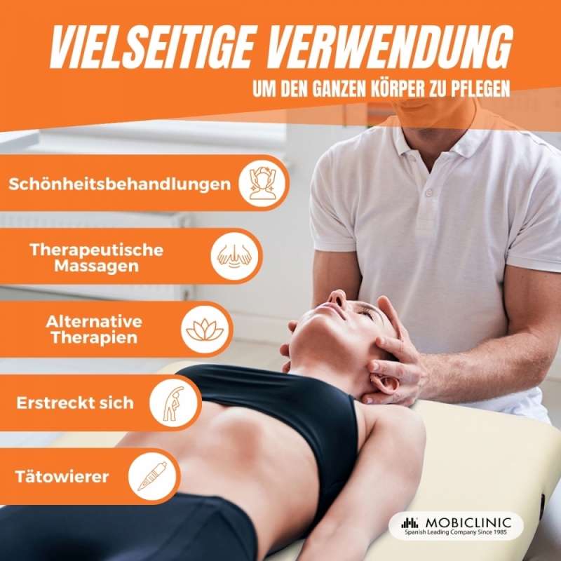 Die Massageliege ist faltbar, so dass sie auch von Personen verwendet werden kann, die sie zu Hause benutzen. Außerdem verfügt sie über ein automatisches Verriegelungssystem zum Öffnen und Falten.