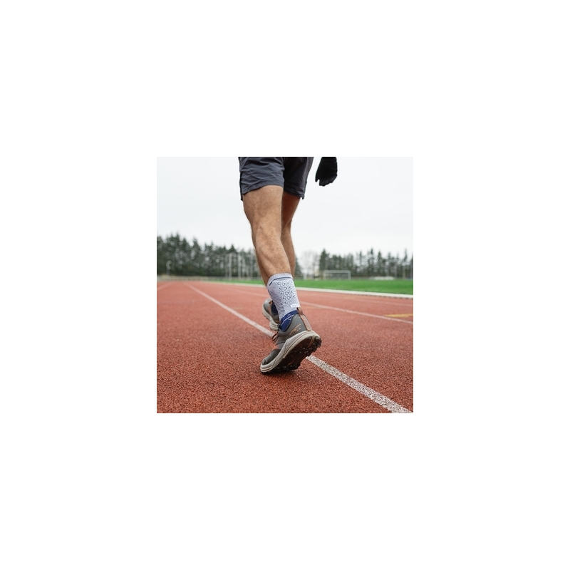 Hochelastisches Gewebe aus atmungsaktivem Material für effektive Kompression und hervorragenden Komfort. Das anatomisch geformte Gestrick sorgt für hohen Tragekomfort. Das integrierte Sehnenpolster ist visko-elastisch und anatomisch geformt. Ein herausnehmbarer Fersenkeil ist in die Bandage integriert. Um den Höhenunterschied des anderen Fußes auszugleichen, ist zusätzlich ein viskoelastisches Fersenkissen eingearbeitet.