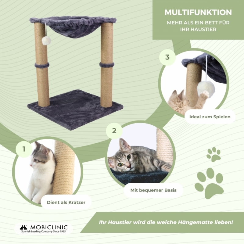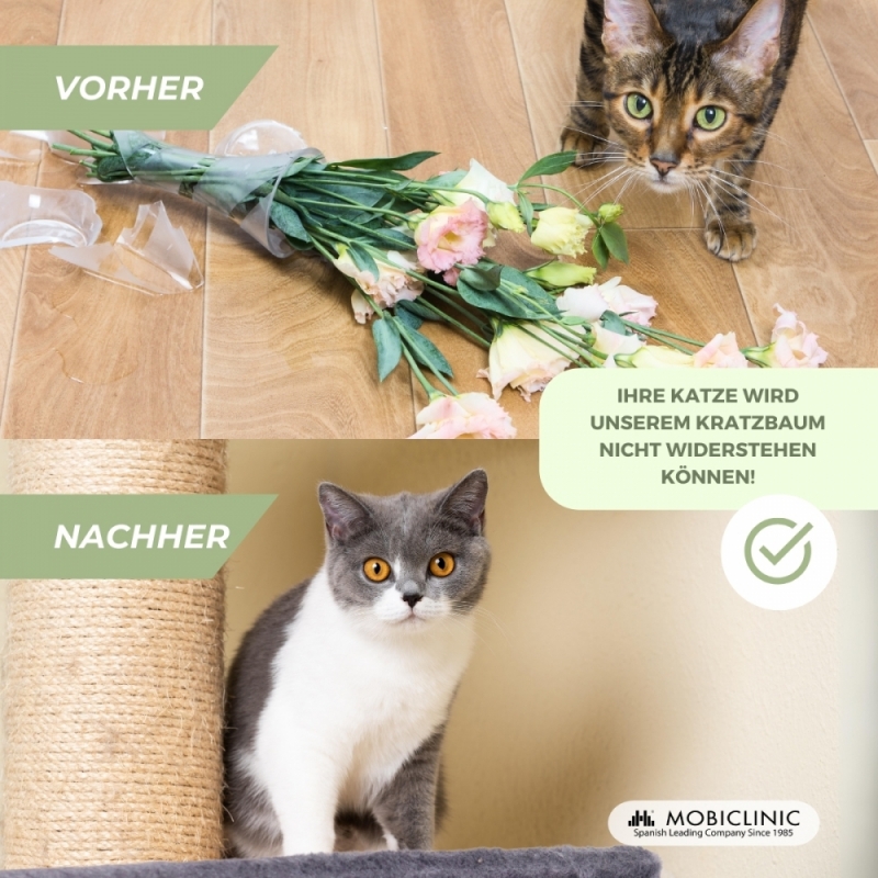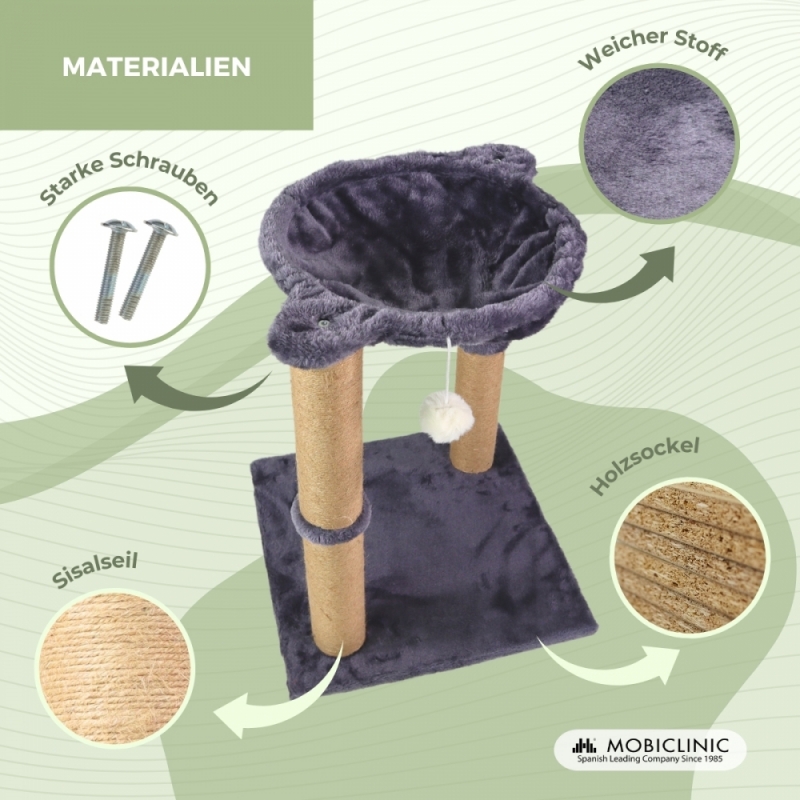 Der Kratzbaum verhindert, dass unsere Katze ihr katzenartiges Wesen auf unserem Sofa oder anderen Gegenständen im Haus ausdrückt und Schaden anrichtet. Es ist ein Gegenstand, der für sie eine entstressende Funktion erfüllt und ständige Reparaturen zu Hause verhindert. Dabei ermöglicht das Sisalseil ein problemloses und bruchfreies Einschlagen der Nägel.