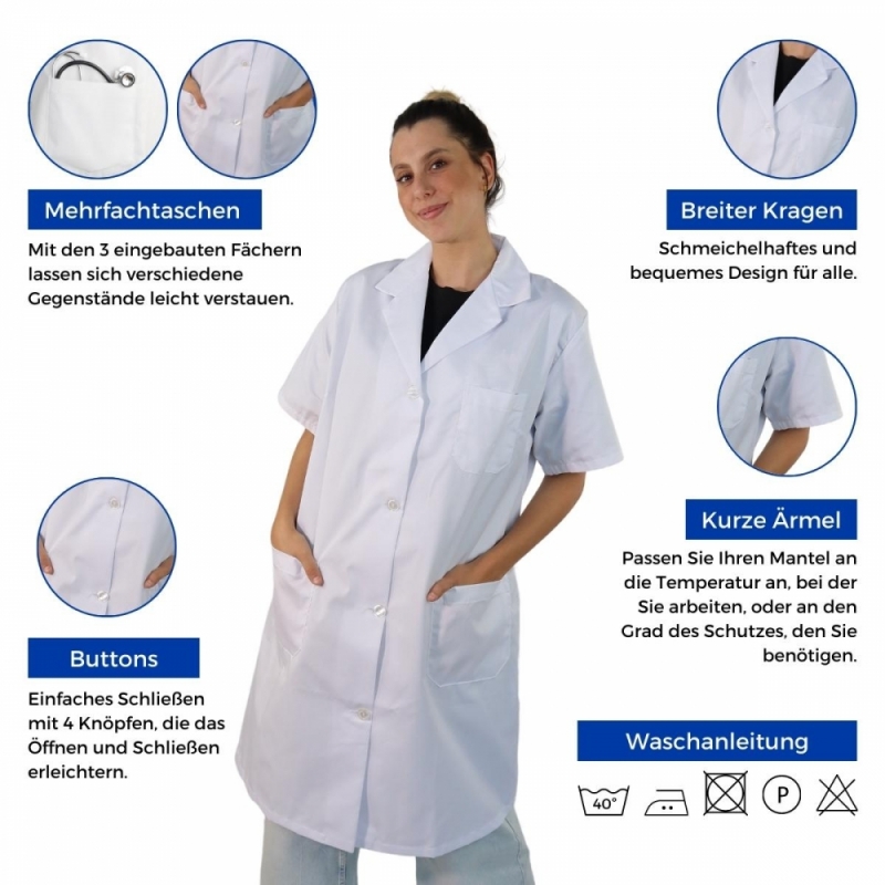 Hygienekittel für Damen | Kurze Ärmel | mit Taschen | einfaches Waschen und Bügeln | Weiß | verschiedene Größen | Mobiclinic