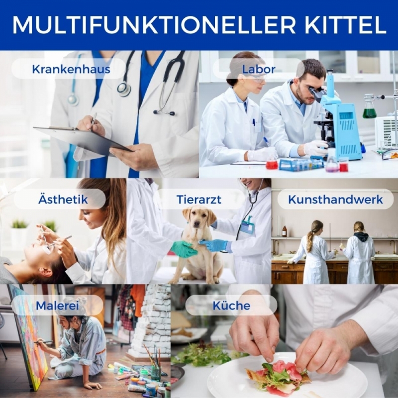 VIELSEITIG UND MULTIFUNKTIONAL: Es handelt sich um einen Kittel, der in verschiedenen Berufen verwendet werden kann, vom Arzt, der Krankenschwester, der Kosmetikerin, dem Apotheker oder dem Tierarzt.