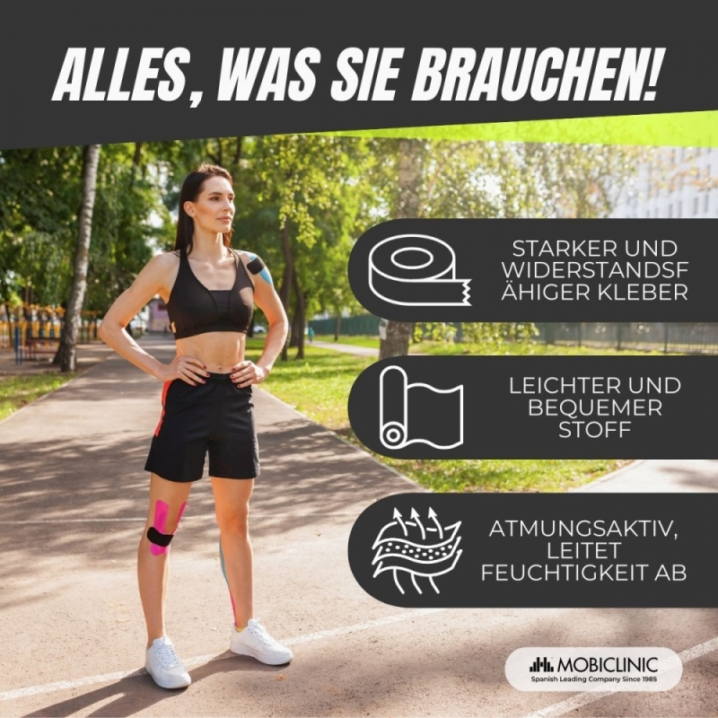 Verletzungen wie Knöchelverstauchungen, Ödeme, Epicondylitis oder Plantarfasziitis können mit diesen Kinesiologie-Tapes, die die Kontraktion des geschwächten Muskels verbessern, schnell gelindert werden.