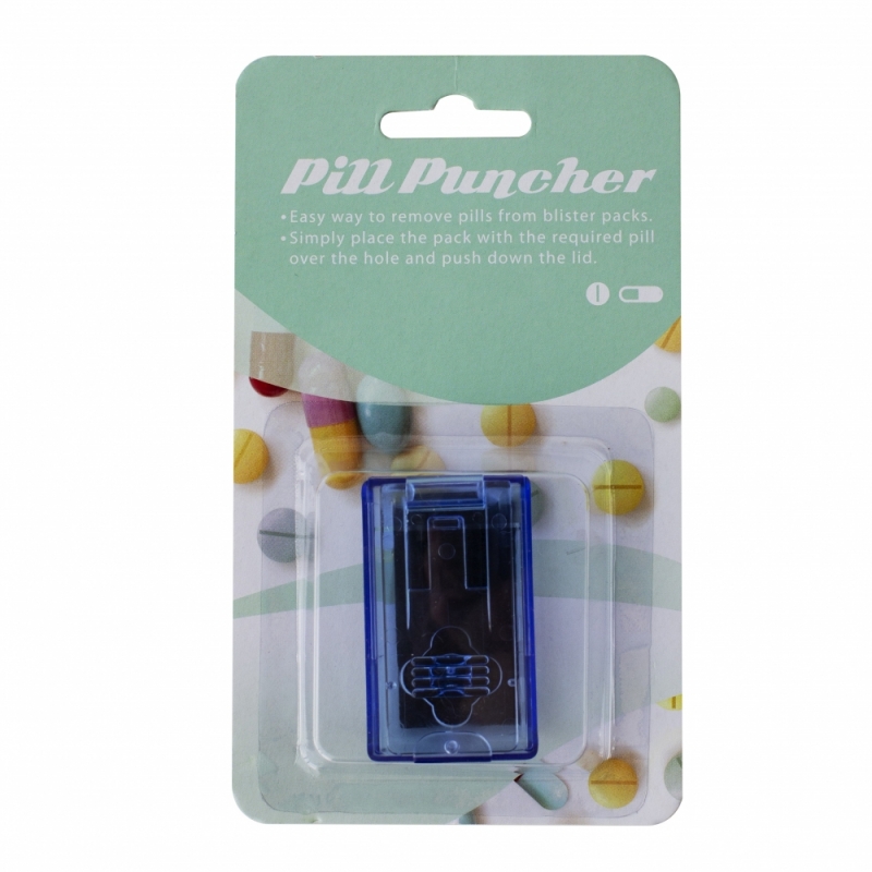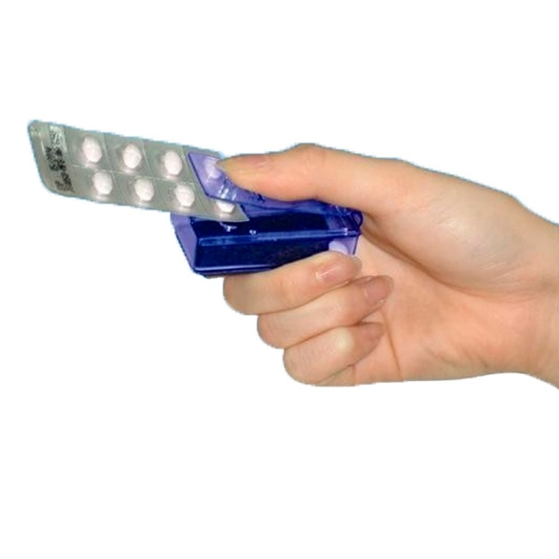 Tablettenentnahmegerät zum einfachen und bequemen Entnehmen von Medikamenten aus Blisterpackungen. Das Produkt ist eine große Hilfe für Menschen mit empfindlichen oberen Gelenken, die Schwierigkeiten haben, ihre Dosis ohne fremde Hilfe einzunehmen.