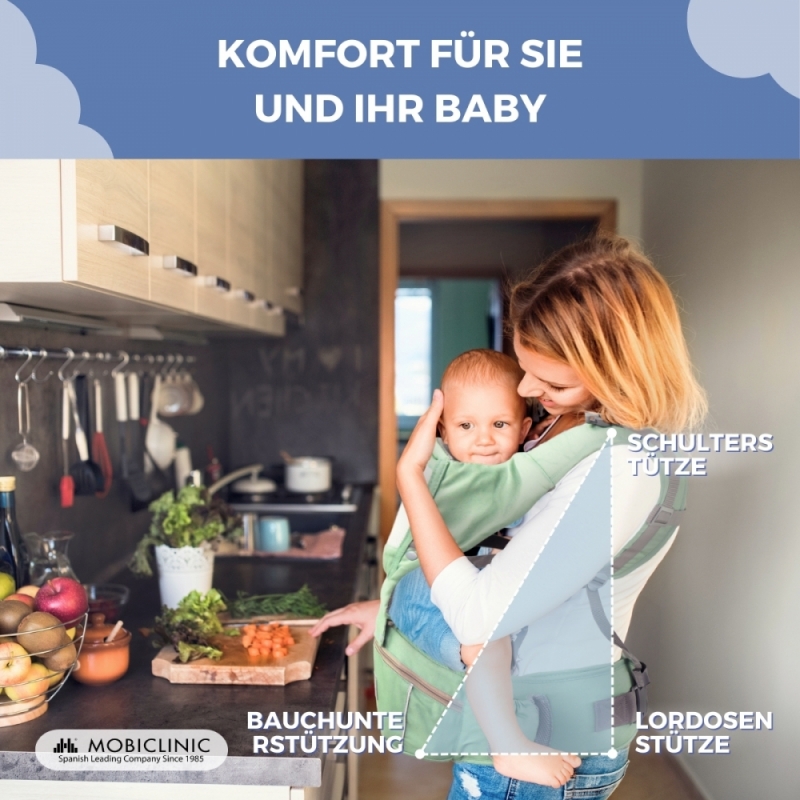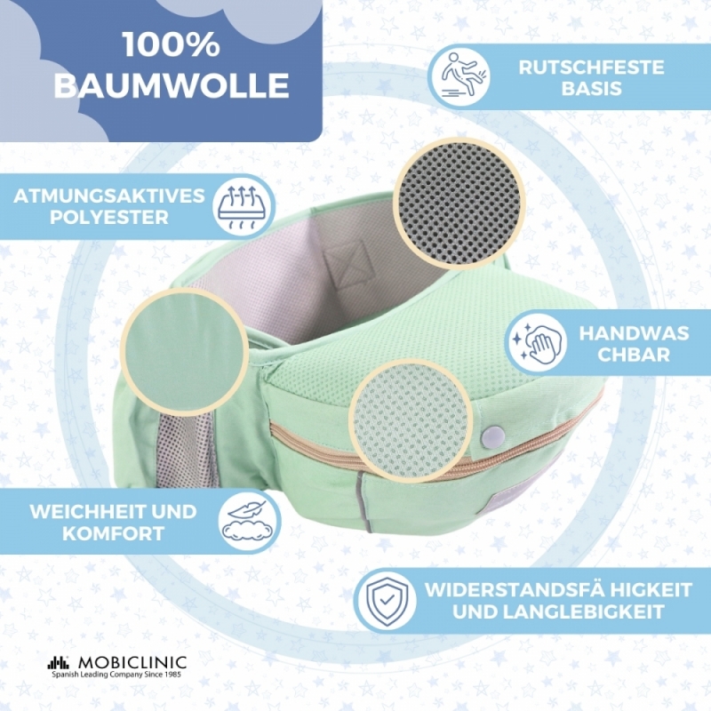 6-in-1-Babytrage | Atmungsaktiv | 0–36 Monate | Verstellbare Träger | Baumwolle | Tasche | Grün | Moley | Mobiclinic