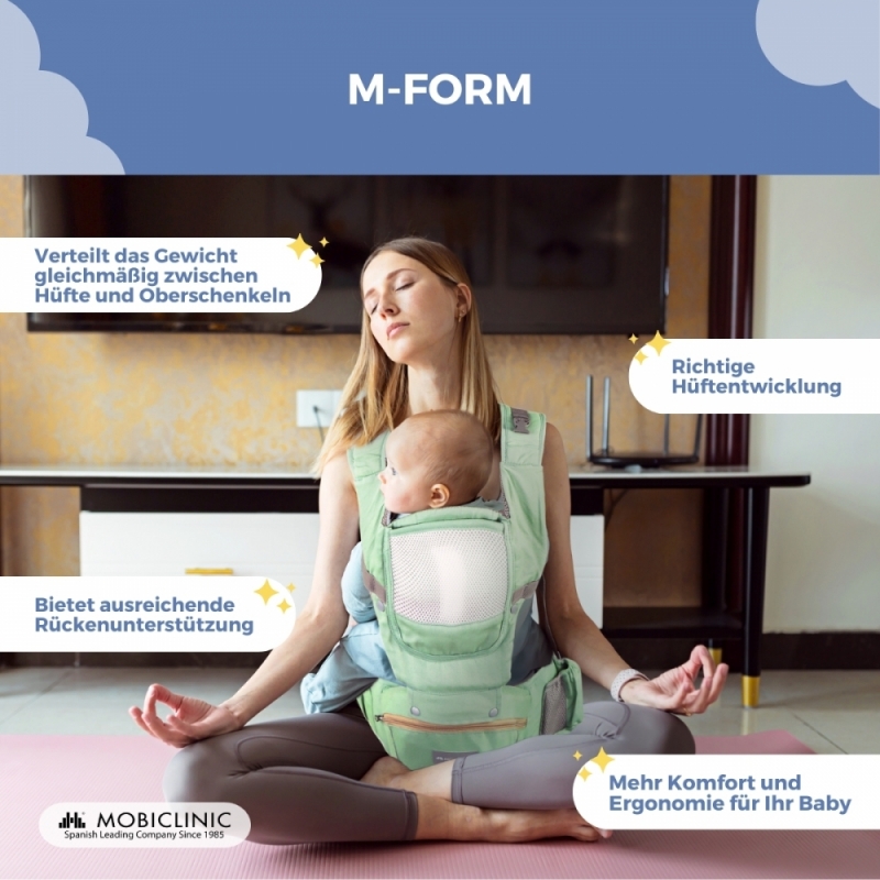 ERGONOMISCHE M-POSITION: Die Babytrage fördert die ergonomische Haltung des Babys, indem es ihm ermöglicht, die natürliche Hockhaltung einzunehmen. Wenn das Baby sitzt, bietet der Rucksack eine günstige M-förmige Position, die für die Entwicklung und den Komfort des Kleinen optimal ist und eine ausreichende Unterstützung für Rücken und Hüfte gewährleistet.