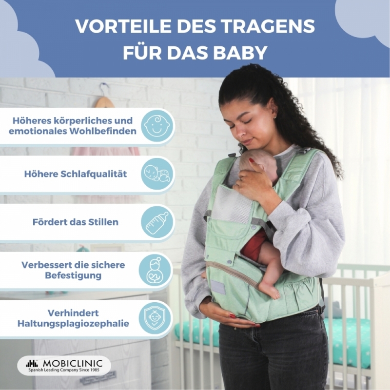 Neben der Förderung der Bewegungsfreiheit trägt die Babytrage dank der vertikalen Position, die das Verdauungssystem und den Ausstoß von Gasen begünstigt, zur Reduzierung von Koliken und zur Stärkung der Muskulatur des Babys bei. Dies führt zu ruhigeren und emotional stabileren Babys, die sich durch das Gefühl von Sicherheit und Wohlbefinden weniger Stress verspüren und daher weniger weinen.