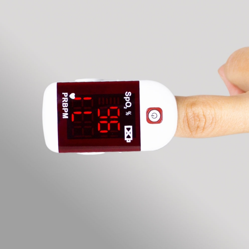 Dieses kompakte und leichte Fingerpulsoximeter verfügt über eine digitale LED-Anzeige, die den Prozentsatz der Sauerstoffsättigung des Blutes (SpO2) und den Puls anzeigt.
