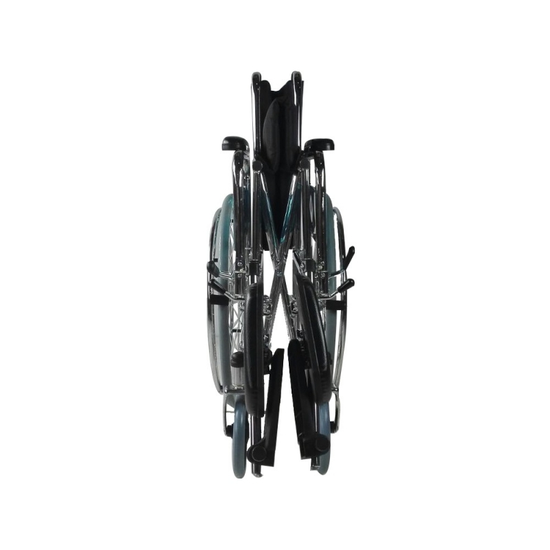 Der Faltrollstuhl hat auch einen Satz fester Räder. Diese Eigenschaft schließt das Risiko einer unglücklichen Panne aus und macht ihn ideal für den Einsatz in Innenräumen.