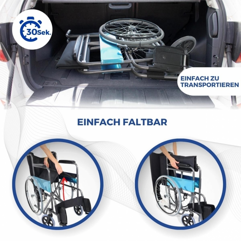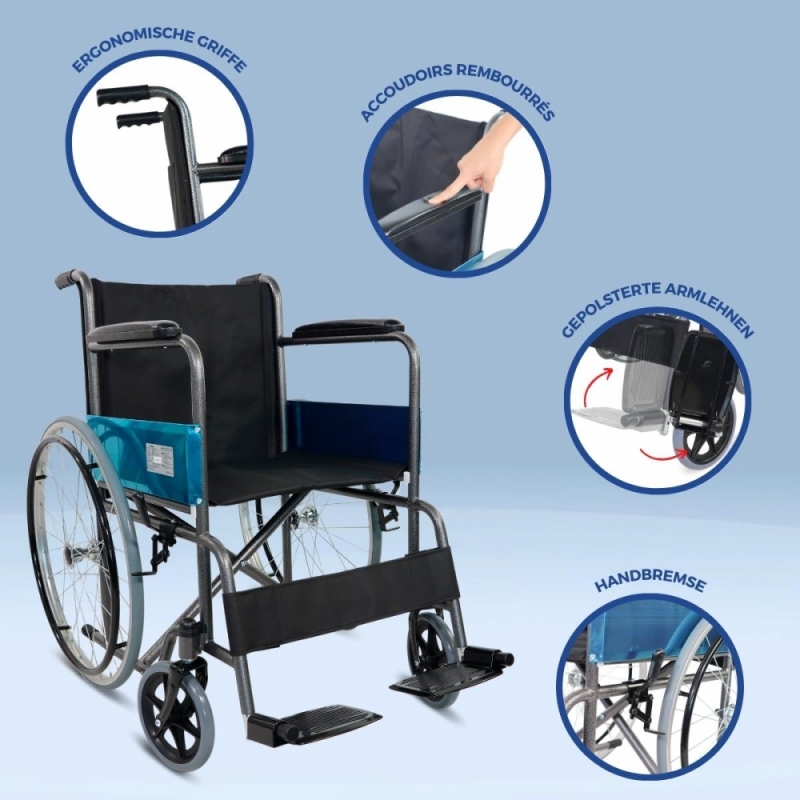 Darüber hinaus enthält dieser leichte Rollstuhl klappbare Fußstützen für eine größere Sicherheit für den Benutzer und gepolsterte Armlehnen, die den Komfort erhöhen und mögliche Wundreibungen verhindern.