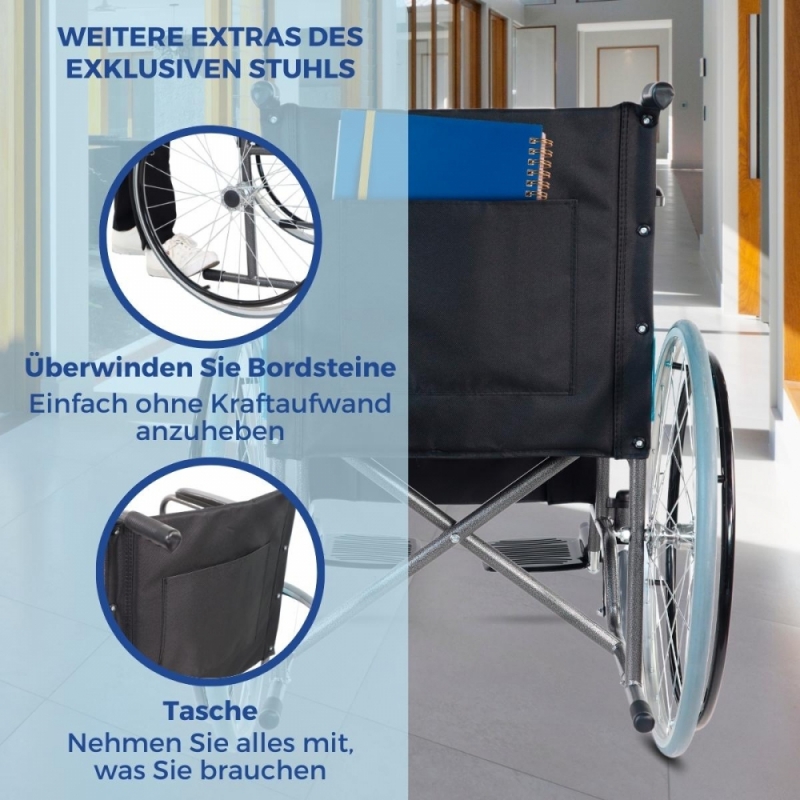 Er hat eine solide Basis aus hochwertigem Stahl, so dass der Rollstuhl unter anspruchsvollsten Bedingungen eingesetzt werden kann.