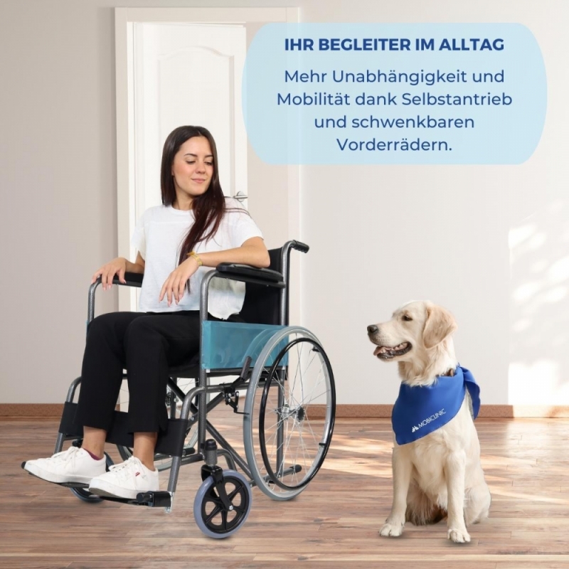 Bei diesem Rollstuhl handelt es sich um einen Transferstuhl, der große Autonomie bietet, mit Rädern die den nötigen Kraftaufwand reduzieren, und manuellen Bremsen, die ein mögliches Umkippen verhindern.
