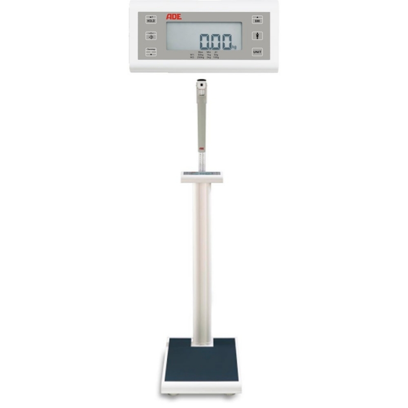 Transporträder sorgen für leichte Mobilität. BMI, Mutter-Kind-Bindungsfunktionen liefern schnelle und eindeutige Ergebnisse über den Ernährungszustand der Patienten. Das drehbare Display ermöglicht ein einfaches Ablesen von der Patienten- und Anwenderseite. Die Waage wird mit Netzstrom und Batterien betrieben, die im Lieferumfang enthalten sind. Der Aufbau der Waage ist schnell und einfach: Sie wird in nur zwei Teilen geliefert und mit einem speziellen Schraubensatz montiert.