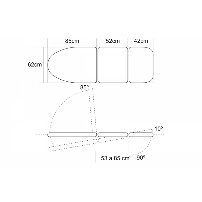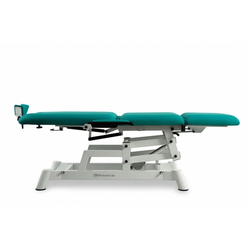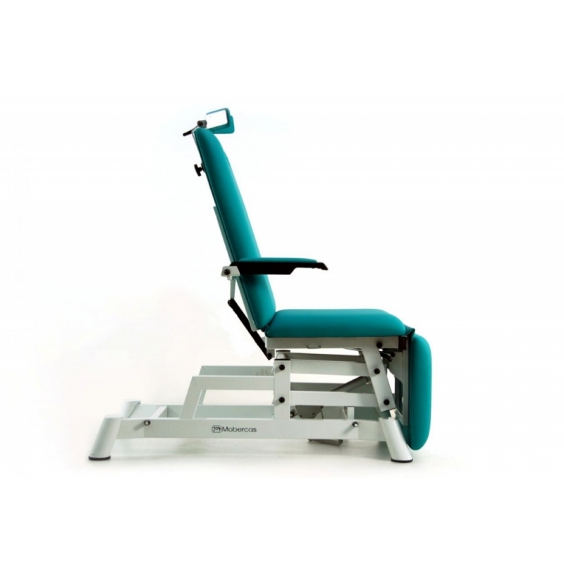 Elektrischer Behandlungsstuhl mit Höhenverstellung durch Handbedienung. Mit um 90º klappbaren Armlehnen (aus Metall und gepolstert) und ergonomischer Kopfstütze für die Ophthalmologie. Kompensierte Trendelenburg-Position.
