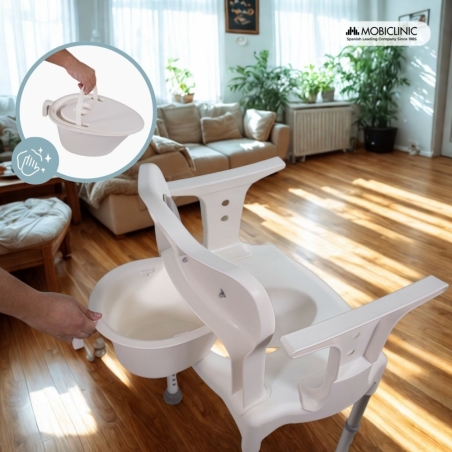 Urinal inklusive: Dieser Stuhl verfügt über ein abnehmbares Urinal, das bis zu 6 kg trägt und ein Fassungsvermögen von bis zu 3500 ml hat. Dies bietet dem Benutzer große Autonomie. Das Entfernen des Urinals ist sehr einfach, was die Reinigung erleichtert und den Stuhl stets hygienisch hält.