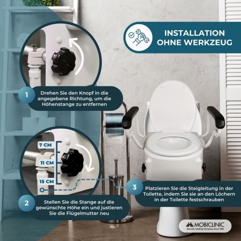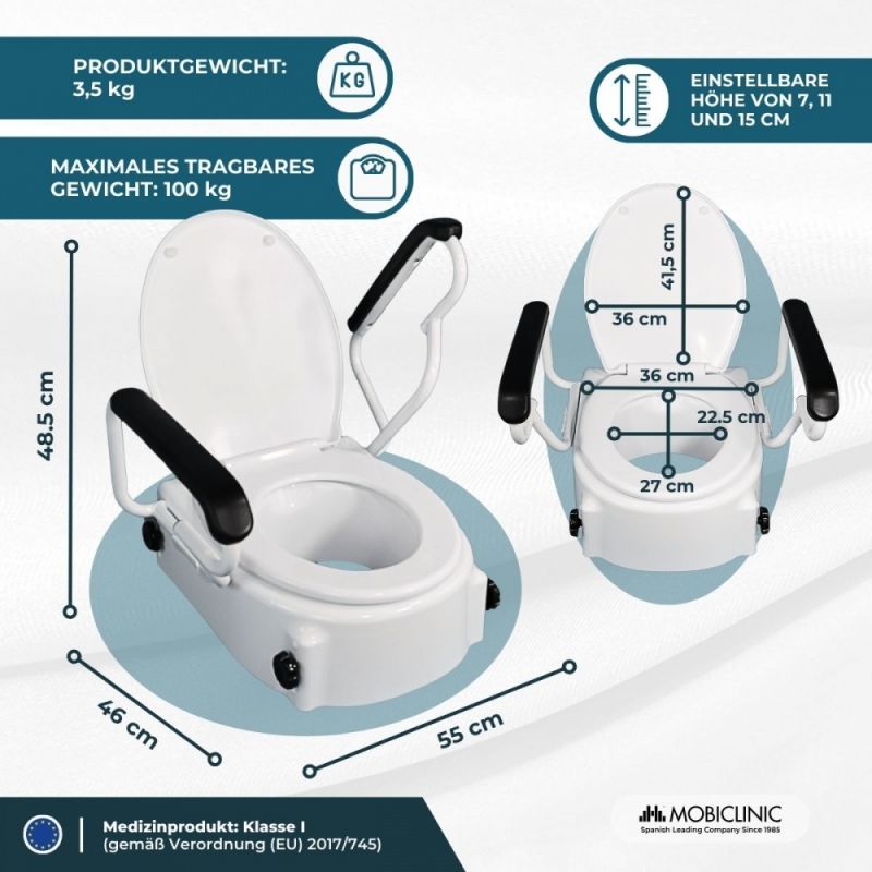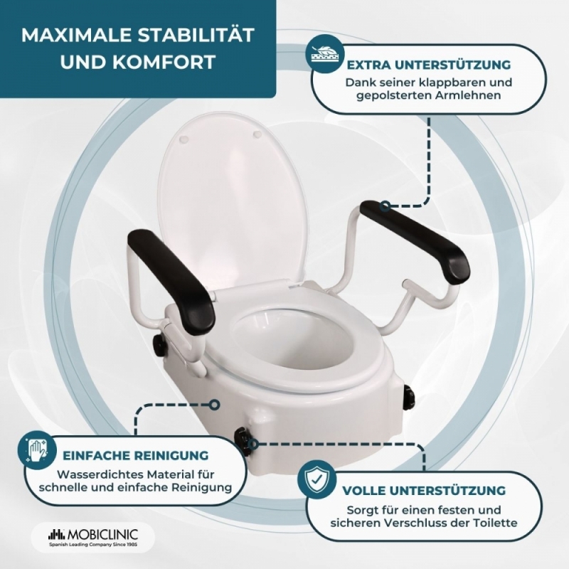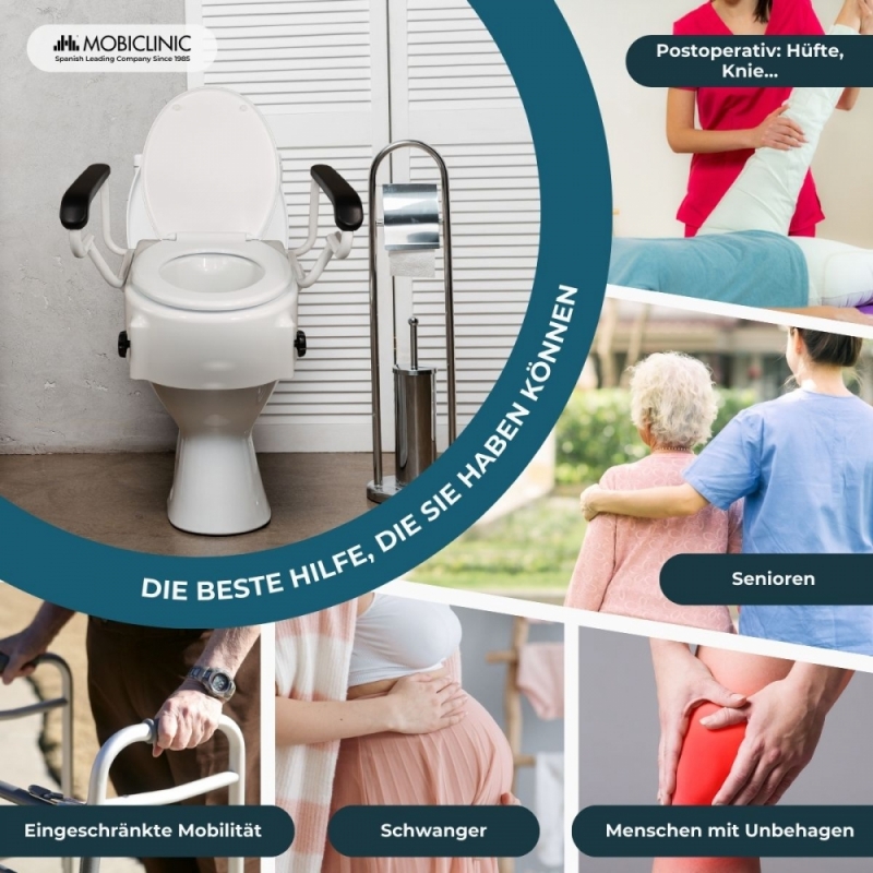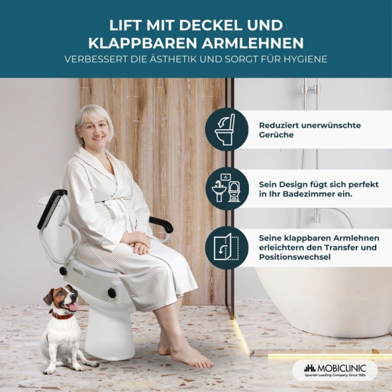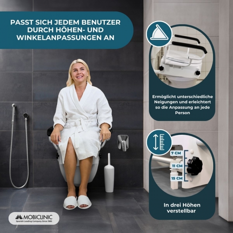 Dieser Toilettensitz mit Armlehne ist ideal für Menschen mit besonderen Bedürfnissen, die eine Toilettenhilfe benötigen: kippbar, verstellbar, mit klappbaren Armlehnen und Deckel, die die tägliche Hygiene erleichtert und ihre Autonomie und ihr Selbstwertgefühl verbessert.