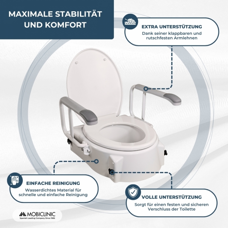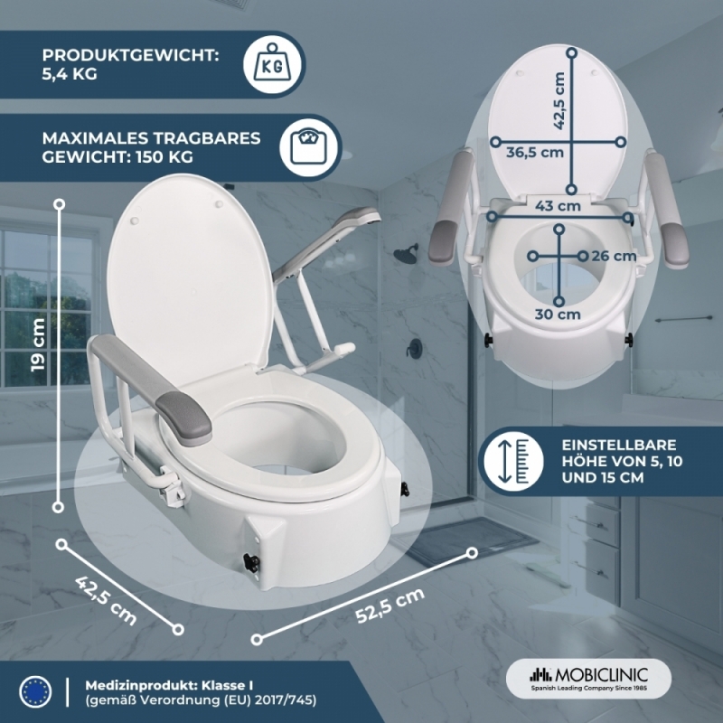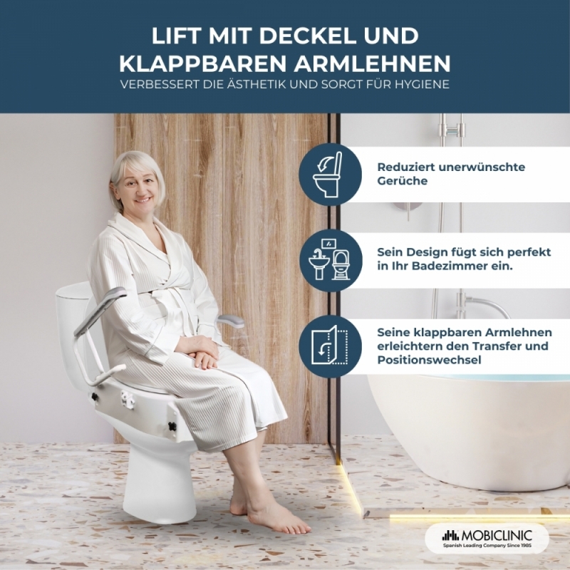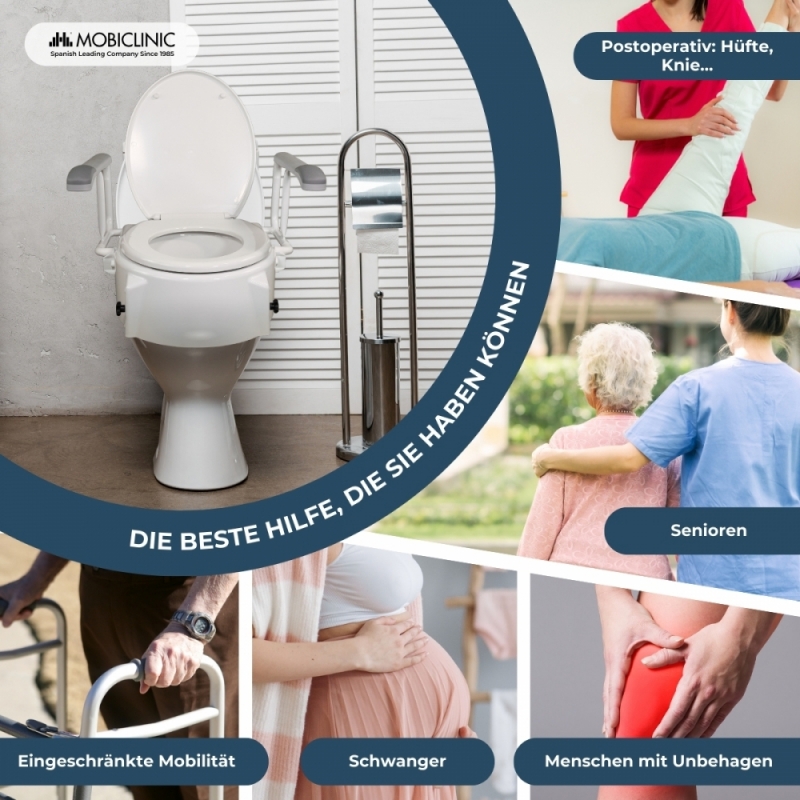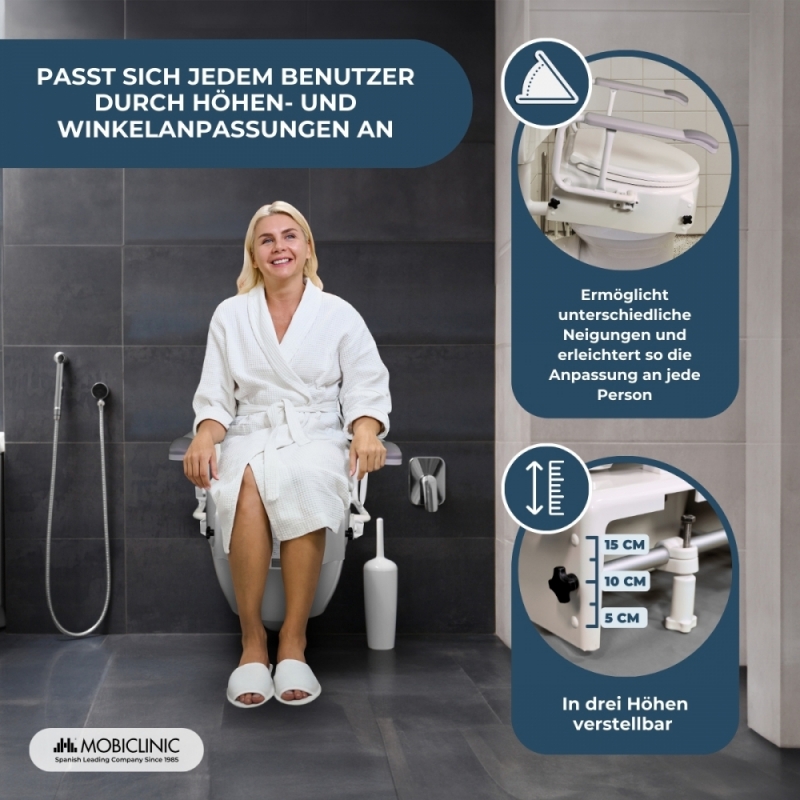 Im Badezimmer benötigen Menschen mit besonderen Bedürfnissen in der Regel neigbare, verstellbare Vorrichtungen, wie einen Toilettensitz mit Armlehnen, um die Hygiene zu erleichtern sowie ihre Selbstständigkeit und ihr Selbstwertgefühl zu stärken. All diese Eigenschaften bietet dieser orthopädische Toilettenaufsatz mit Deckel, verstellbar und neigbar mit klappbaren Armlehnen und natürlich zu einem sehr attraktiven Preis!