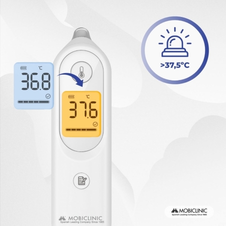 SMART ALERT: Dieses Thermometer verfügt über ein System, das erkennt, wenn die Temperatur 37,5 °C überschreitet. Es gibt einen langen Piepton, gefolgt von drei kurzen Pieptönen, und der orangefarbene Bildschirm leuchtet auf, um den Benutzer deutlich und schnell zu warnen. Eine perfekte Funktion zur sofortigen Fiebererkennung.